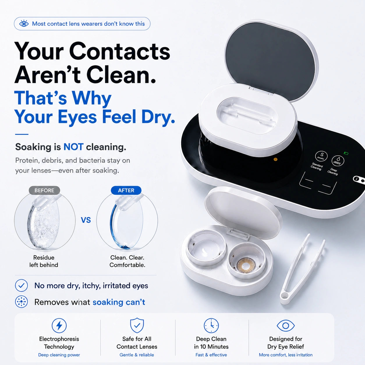 Completes your routine—every tool, as clean as your contact lenses.